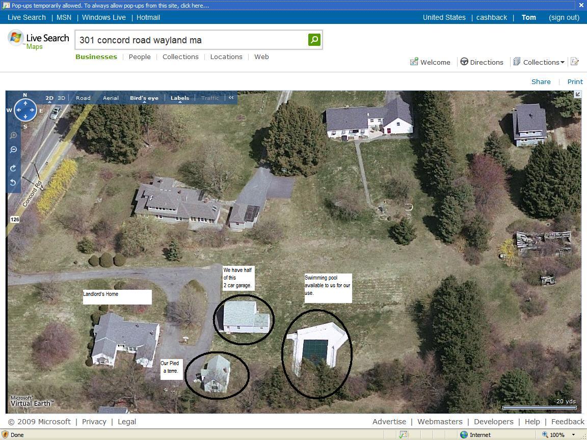 In between Jericho and our next home, we rented a tiny (384 SF) 1 bedroom cottage in Wayland, MA. It was located at 301 Concord Road. It is the small building behind the main house in the picture below (click on photo for larger version).
